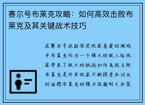 赛尔号布莱克攻略:如何高效击败布莱克及其关键战术技巧