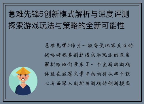 急难先锋5创新模式解析与深度评测 探索游戏玩法与策略的全新可能性